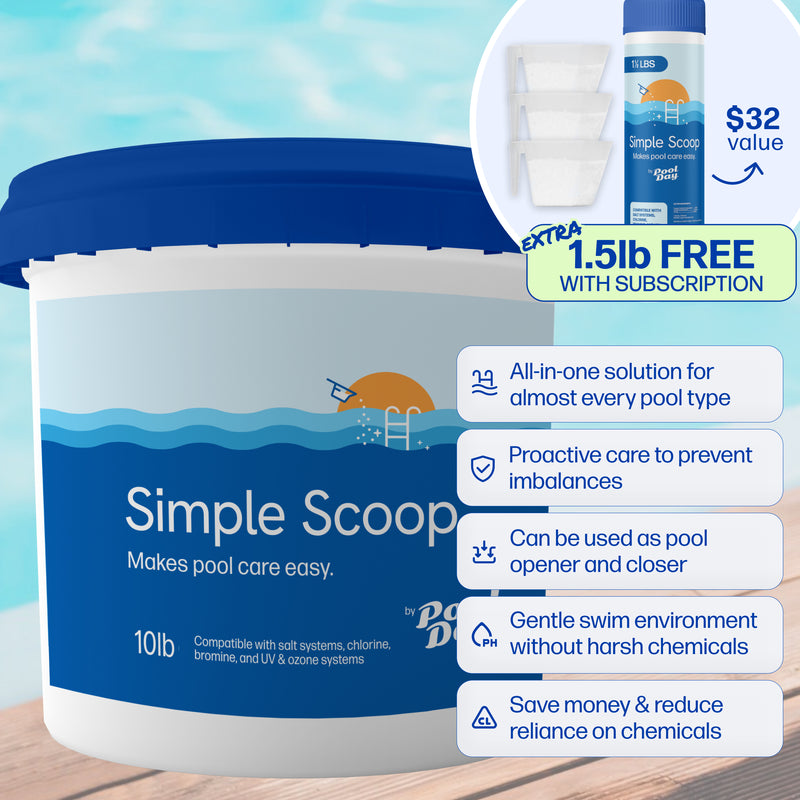 Getting Started: Add a double dose of Simple Scoop right away along with sanitizer! Then, wait 24 hours and your water should be perfect! If your water isn't perfect, reach out to our pool experts for help at help@poolday.com!