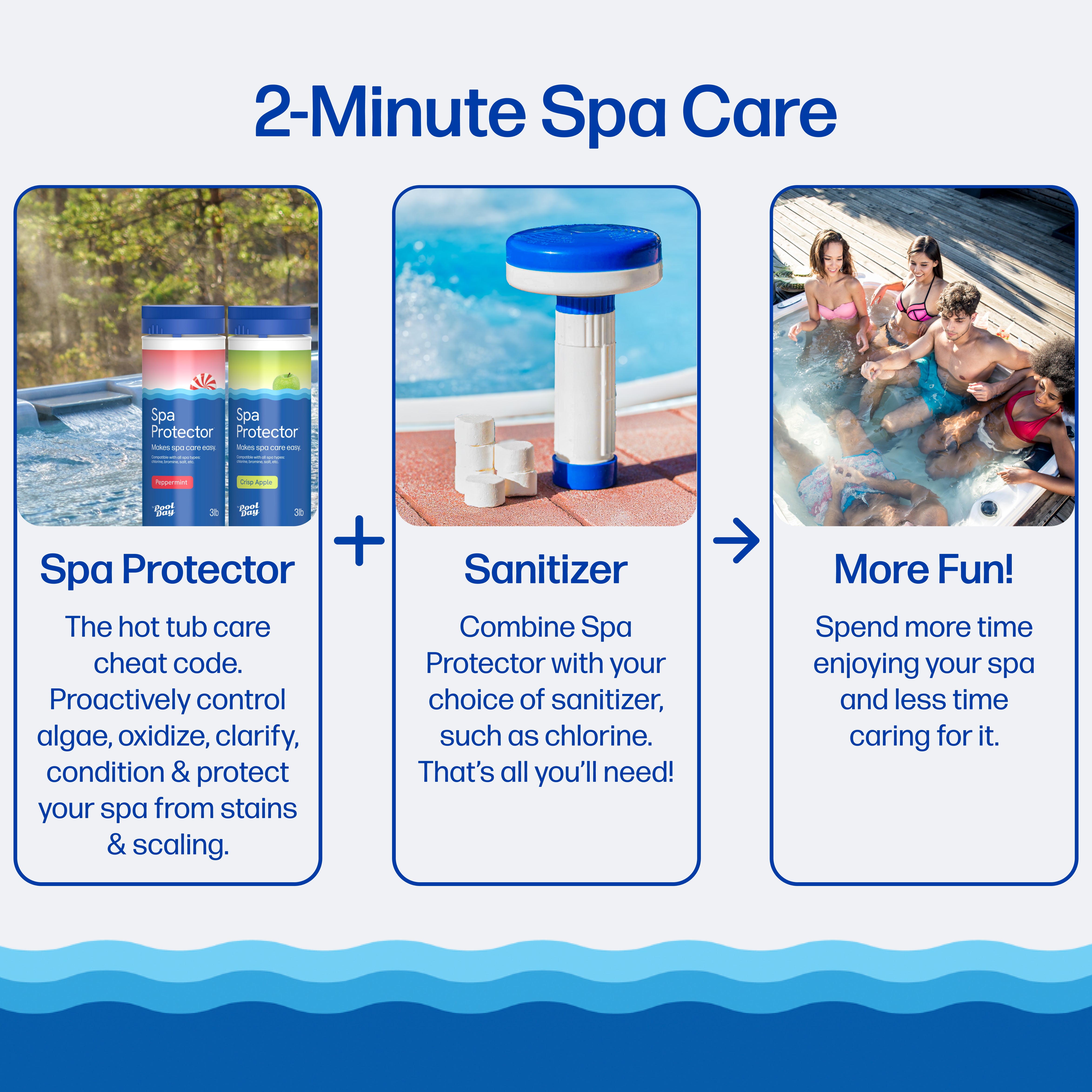 Prevent cloudy water and problems before they start. With Spa Protector, your spa stays fresh and inviting — without last-minute store runs or pricey service calls.
